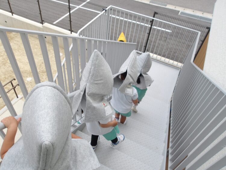 楽しく遊んでいると避難訓練が始まりました!突然の放送にびっくりしつつも、きちんと先生のお話を聞いて避難することができましたよ。