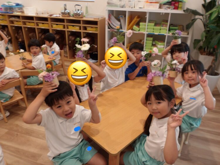 まずはお花の名前を教えてもらって! 触ってみたり、匂いをかいてみたり〜!