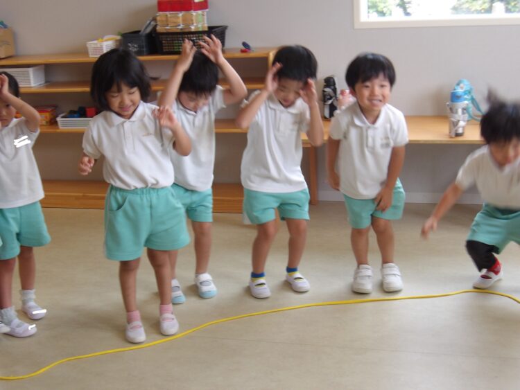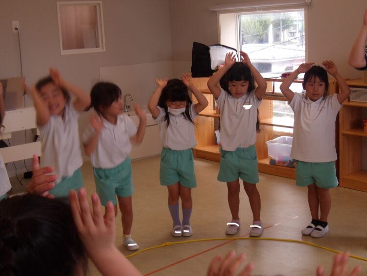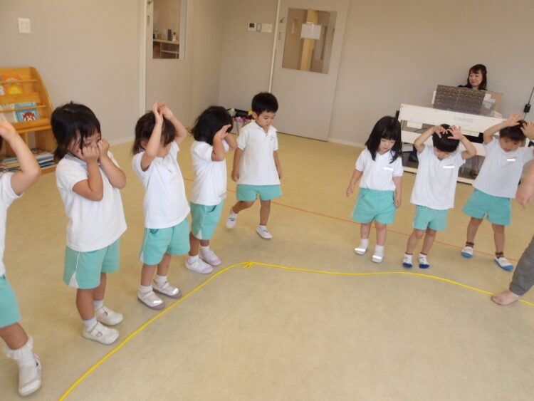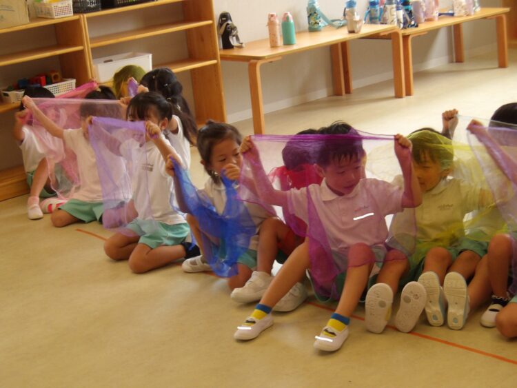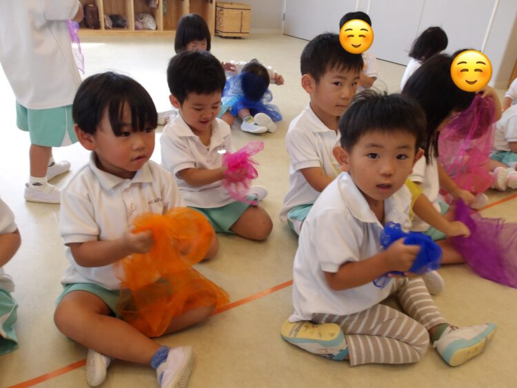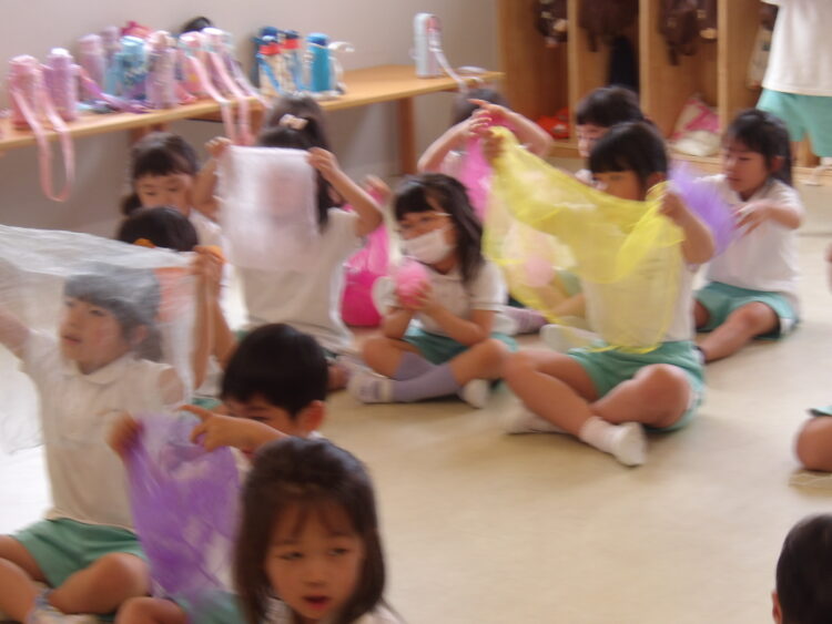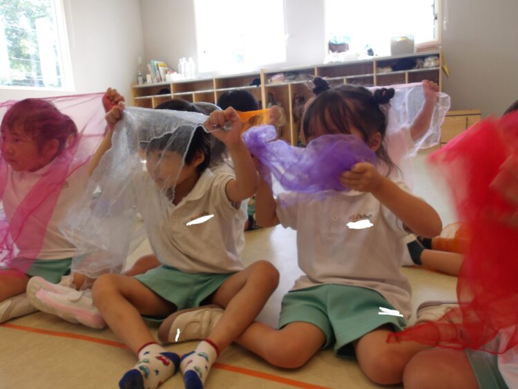 お月見🌕をテーマに、歌を歌いながらうさぎになりきって月の上をジャンプしたり、スカーフを使って顔を隠したり出したりして月が雲に隠れる様子を表現しました