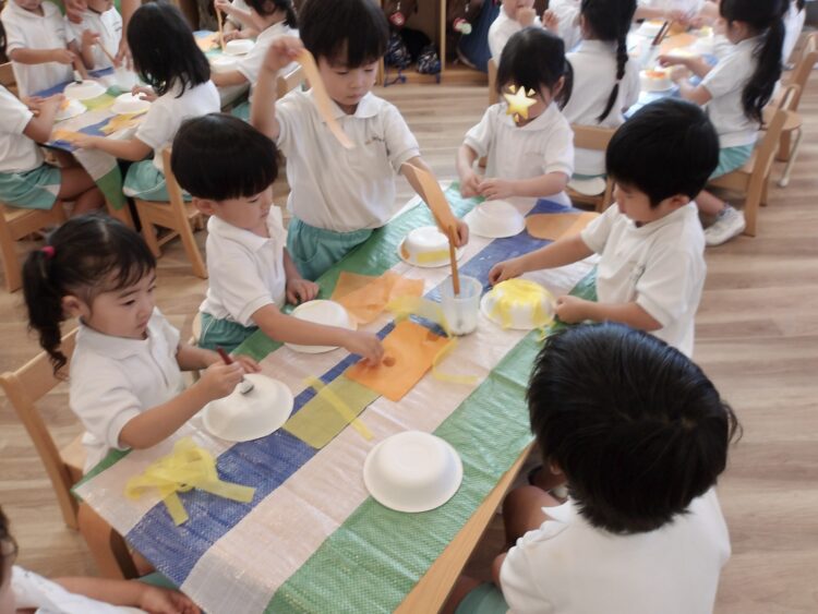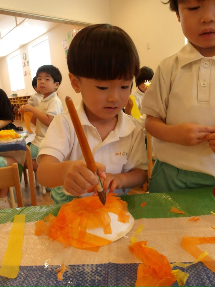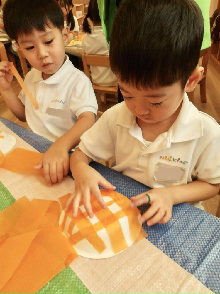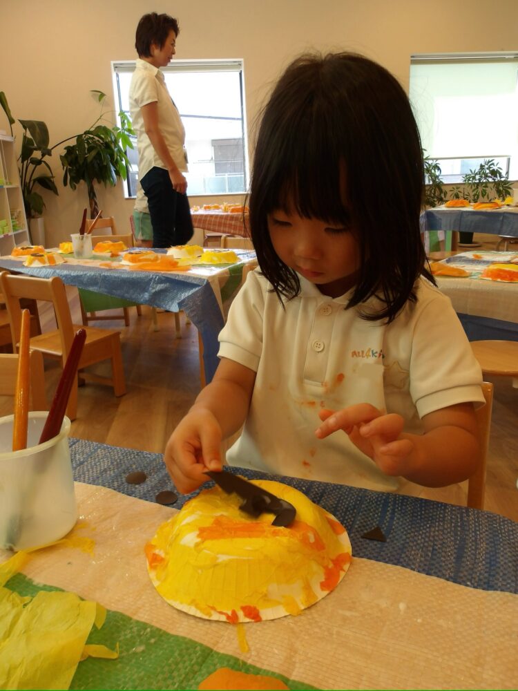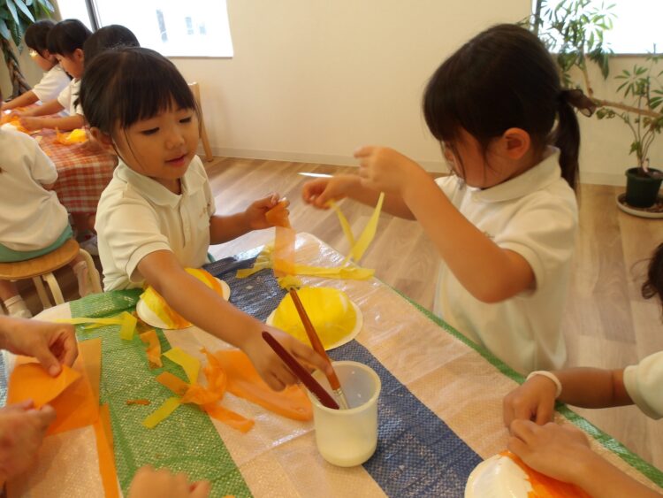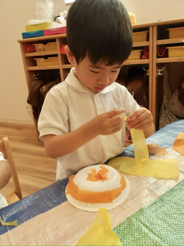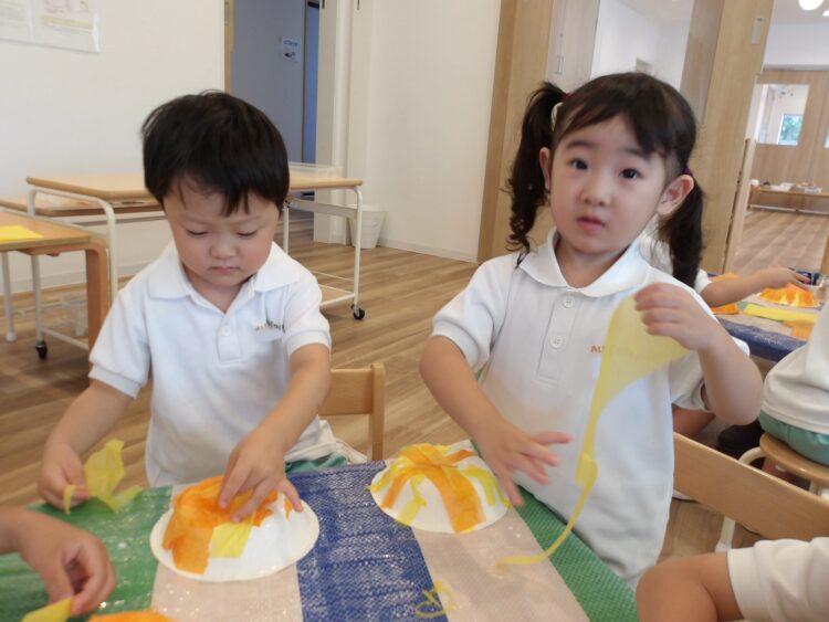 黄色とオレンジ色を交互に貼ったり、平行に貼ったり、お花にように貼ったりと、色使いや貼り方に個性が見られて面白かったです♩
