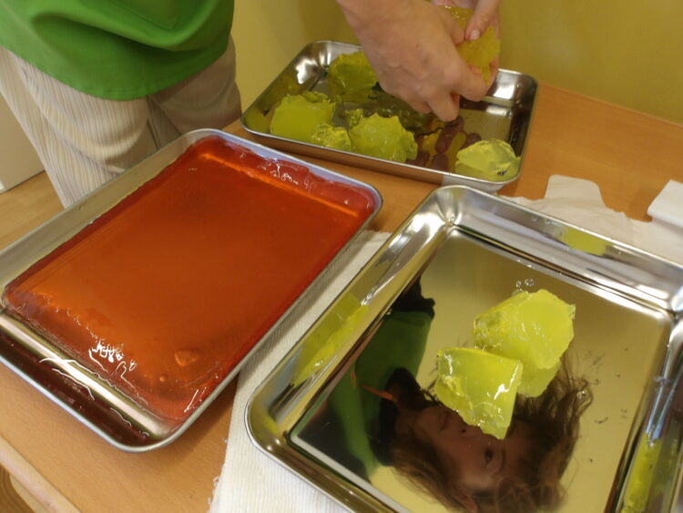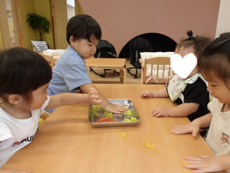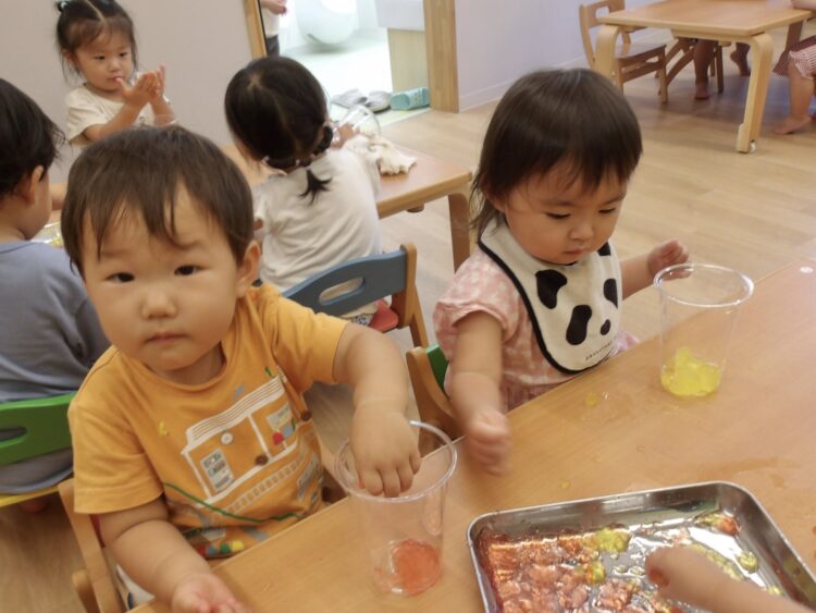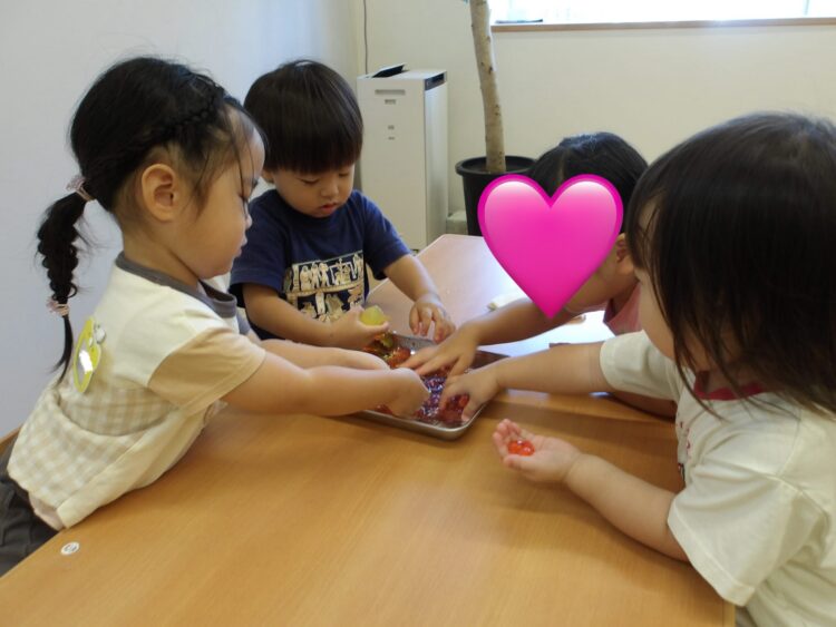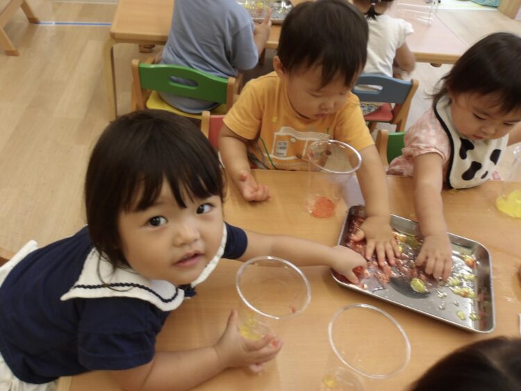 たくさん触って寒天が混ざって、綺麗な色になったね〜!