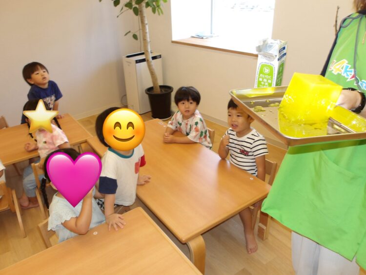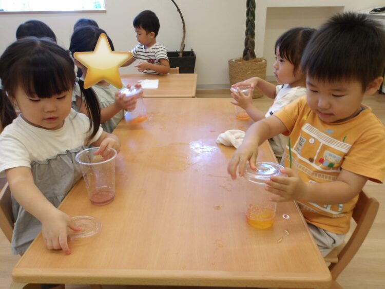 黒い画用紙に黄色を塗ると黄緑に見えた子もいたみたいで、「緑になった!」とと報告しに来てくれるお友だちもいましたよ😃