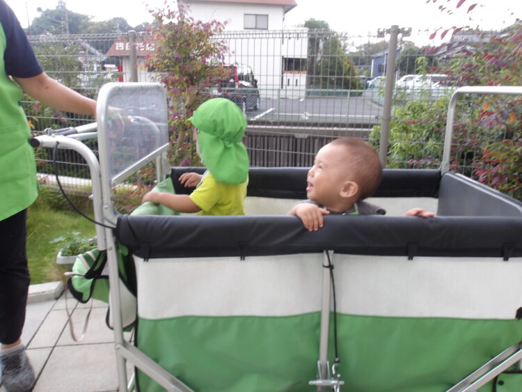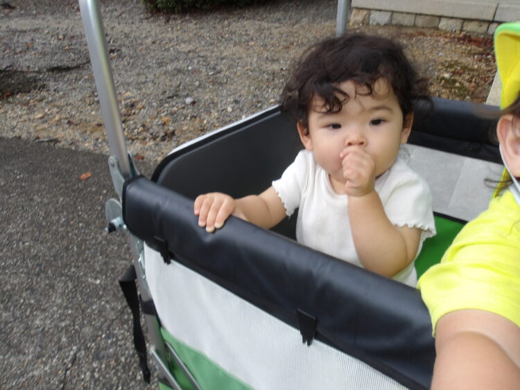 今日は涼しく過ごせました舎利殿にいきまし 初めて立って散歩車に乗っていきました