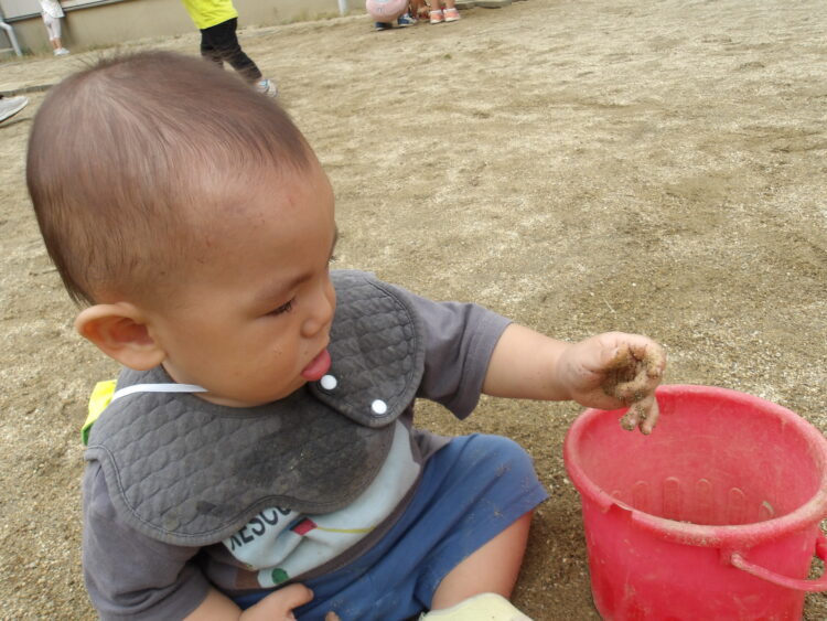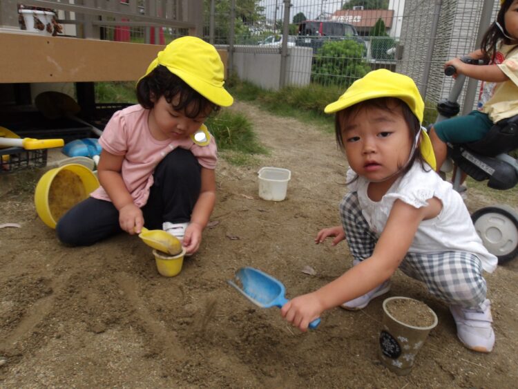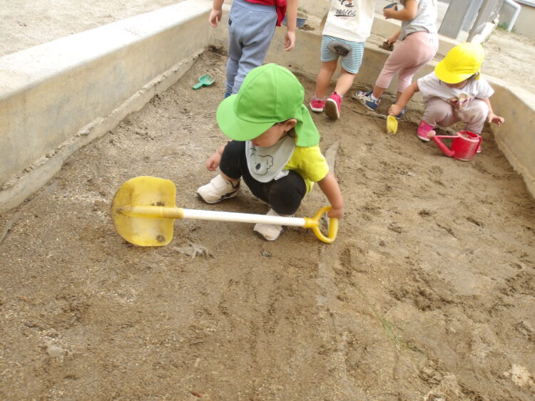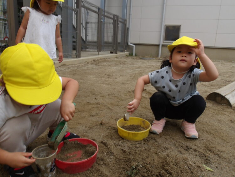 みんなの大好きな犬はいませんでした 園庭では、砂場で遊んだり、バケツの中に砂を入れていました