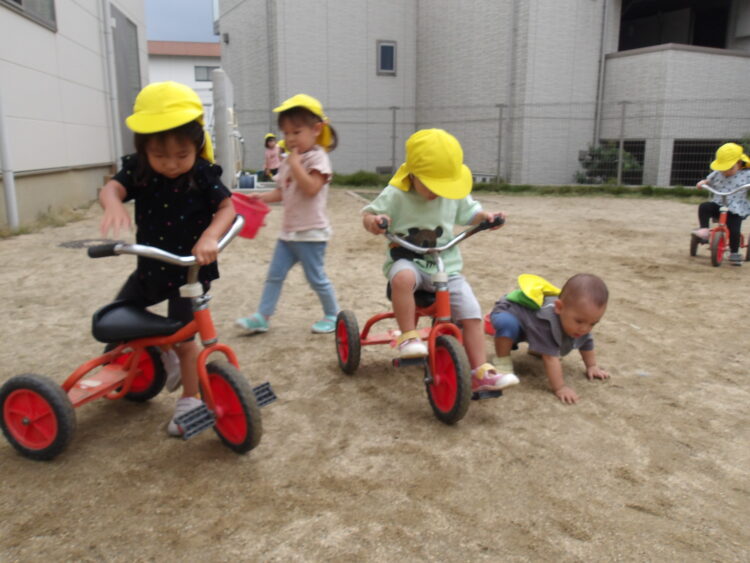 お友達と砂遊びをしたり、三輪車でサイクリングをする姿が見られました😊 滑り台で遊ぶ際には通りかかった子に手を振る子もいました!!