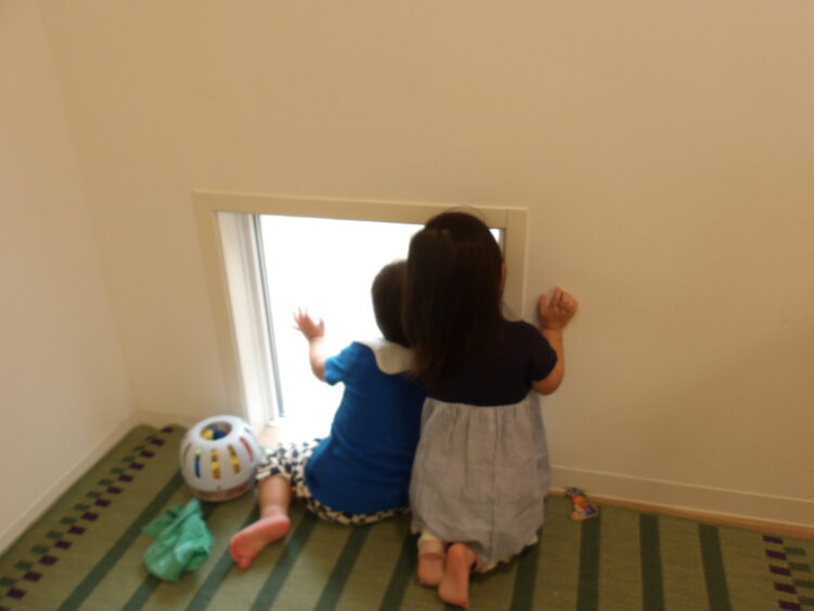 こちらは、ひよこ組の赤ちゃんがお部屋を遊んでいる様子を見ていますよ