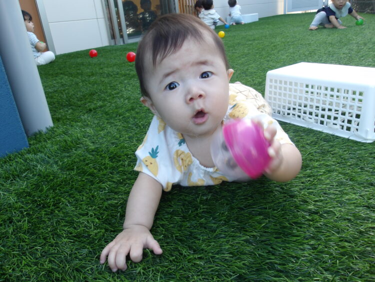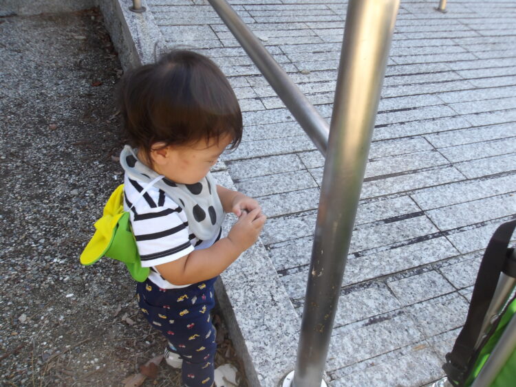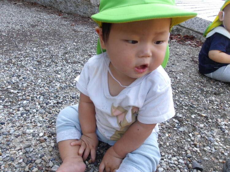 砂利の上に座って葉っぱや石を拾っていましたテラスでは音の鳴るボールで遊んでいました