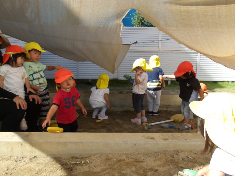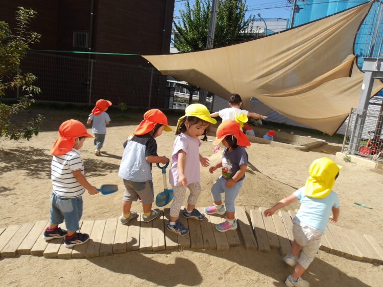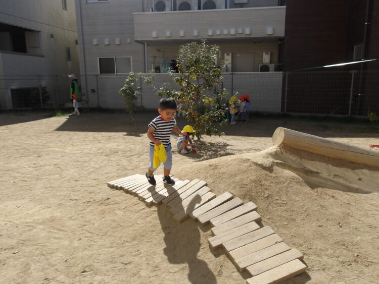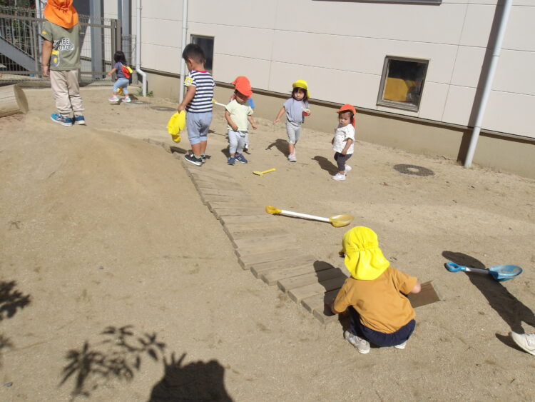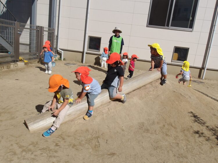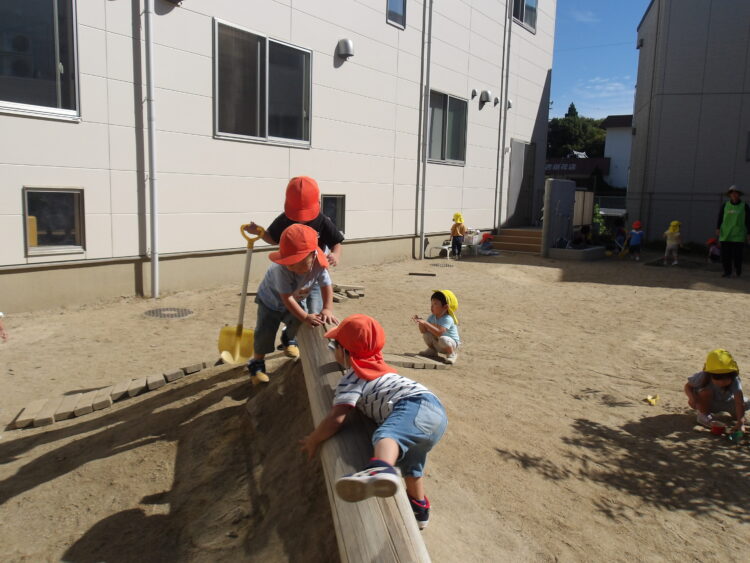 秋晴れが続き、園庭遊びも思う存分楽しめます!砂遊び、や丸太の滑り台をしたり