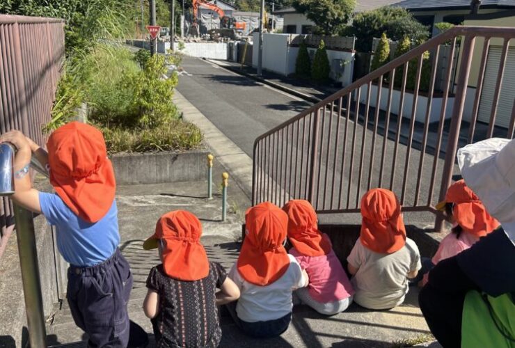 ところが!今日はショベルカーさんはお休みだったみたいで動いておらず、、、今日はお休みなんだねと話していたところで、工事現場で働いてくださっているお兄さんたちを発見✨そこでみんなで応援する事に💖