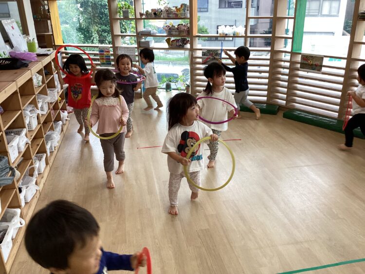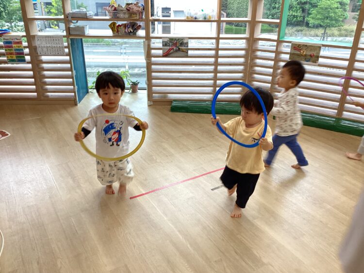 両足をあげたりフープを持ってバランスを取ったりするのが難しく、倒れそうになる子もいましたが、何度もチャレンジして楽しんでいました😊✨
