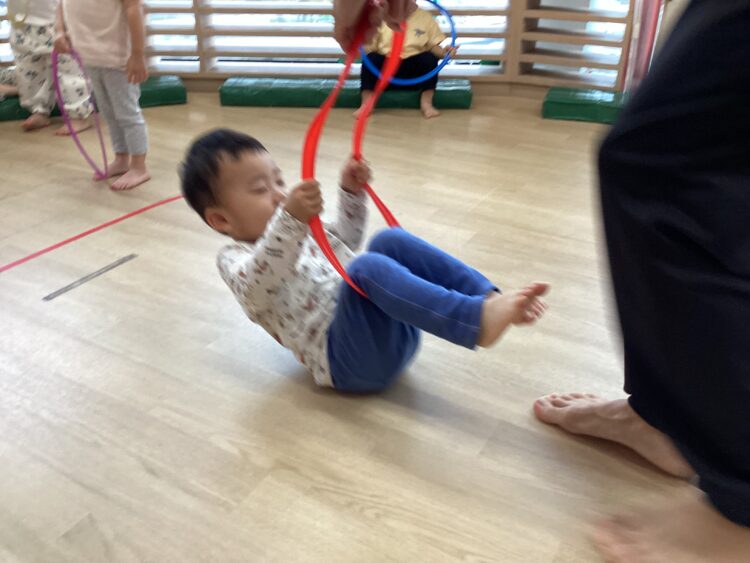 フープに足を通して、両足をあげてバランスをとりながら先生に引っ張ってもらいます💪