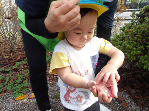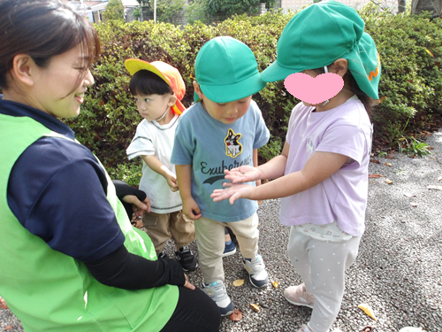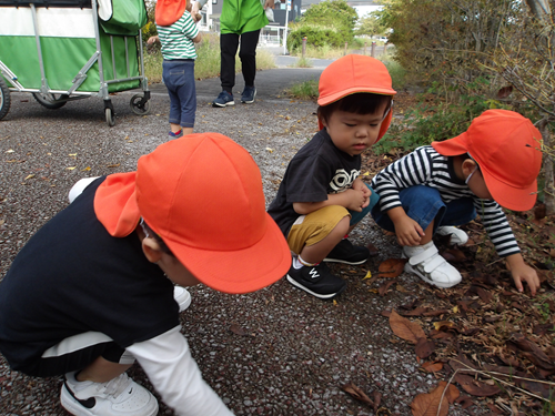 みんなで手を繋いで秋の雲を見たり、虫、花を発見してうれしそうにしたり、