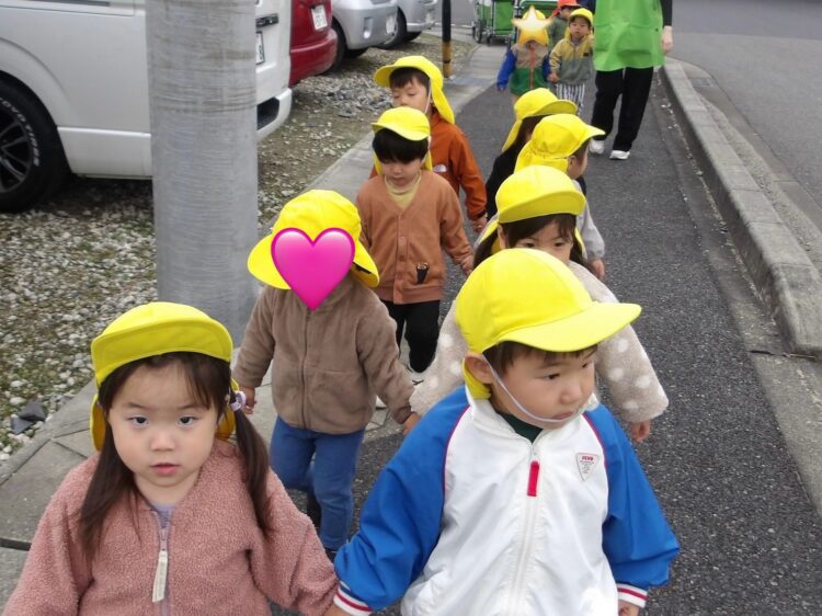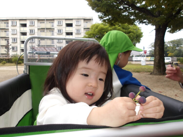 「どんぐりあるかな〜?」とお友だちとお話しながら楽しく歩いています🎵