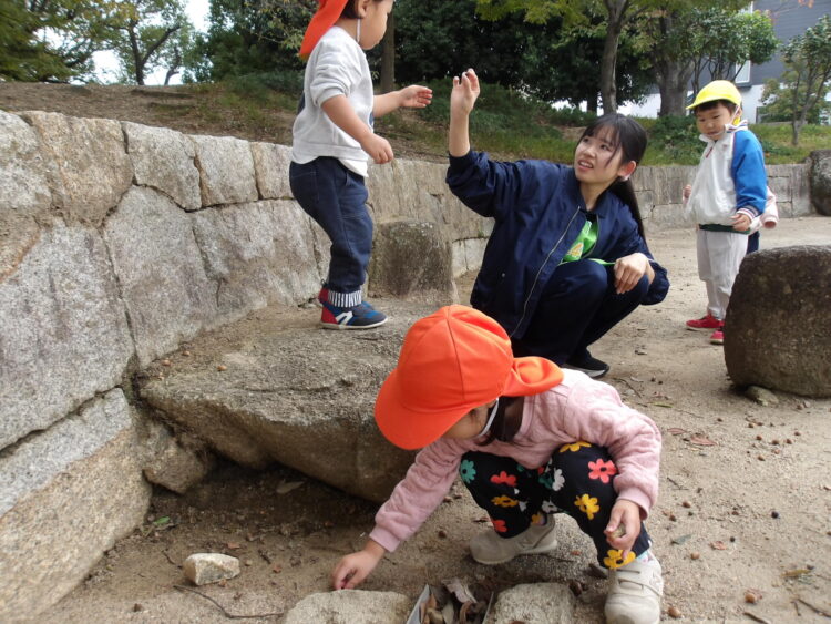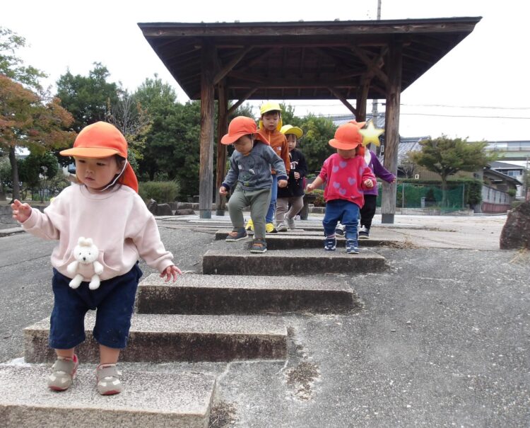 あひる組さんはどんぐり拾いを楽しみ、その後、石の階段をみんなで降りたり登ったりして楽しみました!みんな真剣に登り降りを楽しんでいました😆
