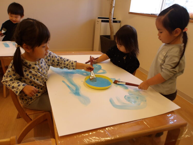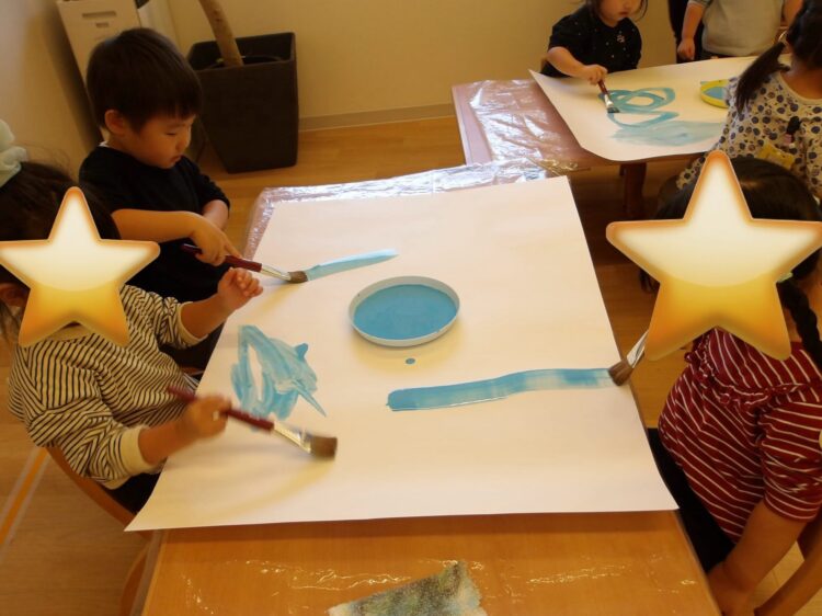 大きな紙に筆を使って絵の具で色を塗ってくれたのはうさぎ組さん🩵