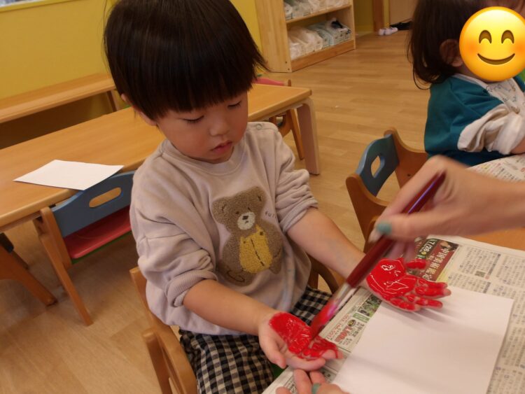 自分で好きな色を選んで、絵の具を手につけて手型をペッタン🖐️