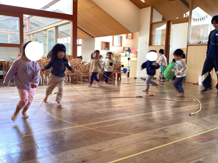 2歳児さんの体操あそびは、縄跳びを使ってヘビさんをしたり しっぽを先生に踏まれないようにみんな頑張って逃げていましたよ![]()