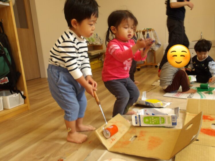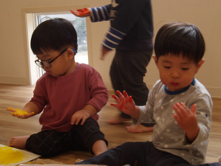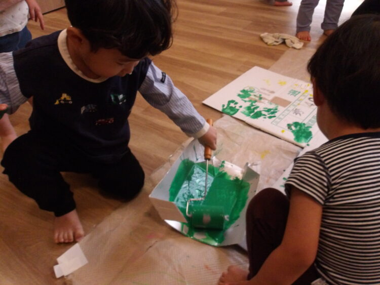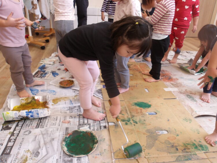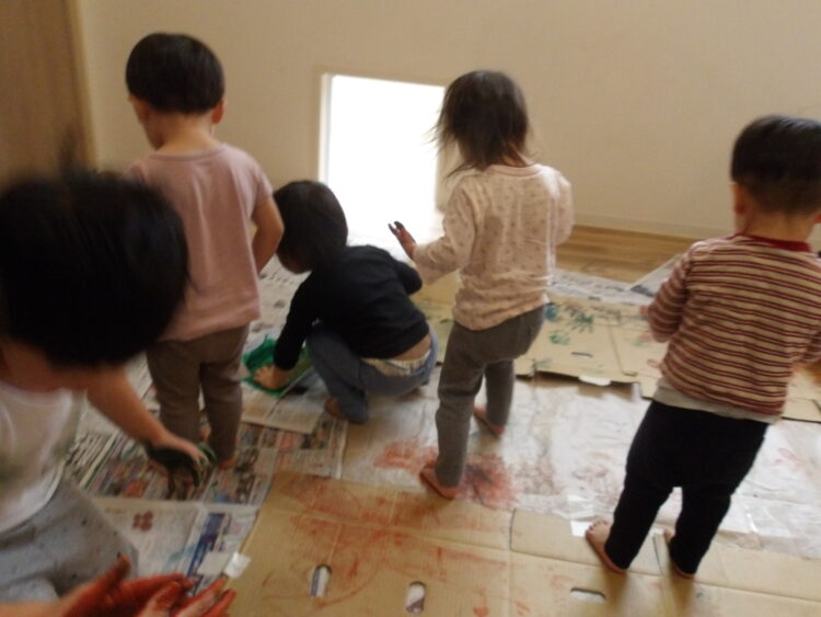 今日のひよこ組、あひる組、うさぎ組は絵の具遊びをしました。筆、ローラー、手足でスタンプ!