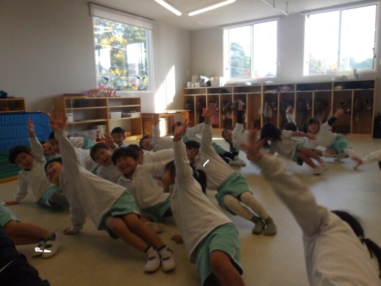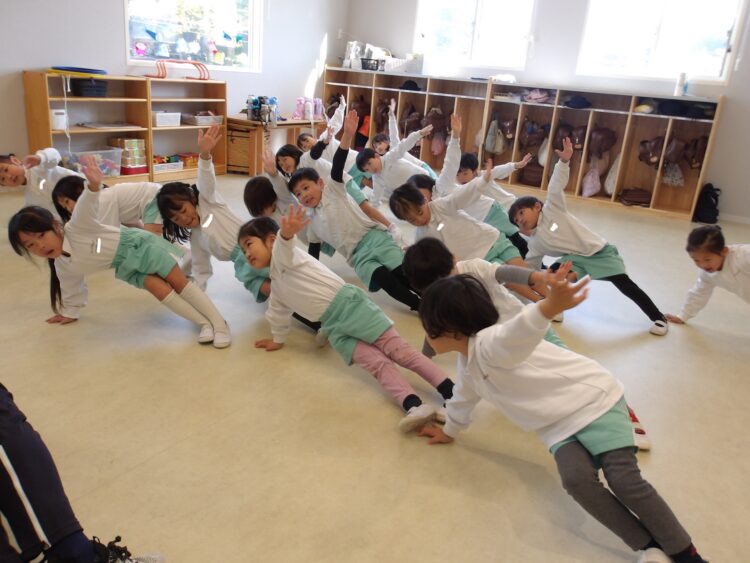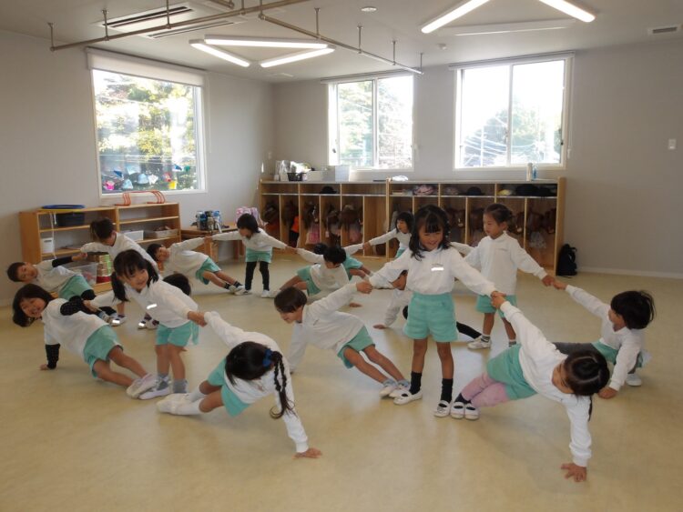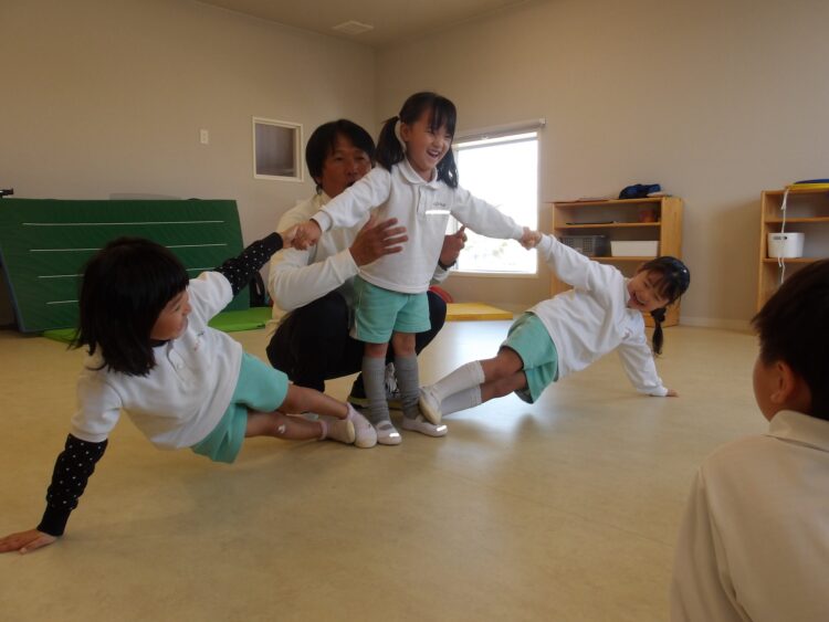 にじ組さんは3人1組になって組体操「扇」に挑戦!