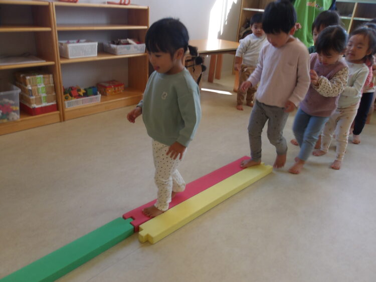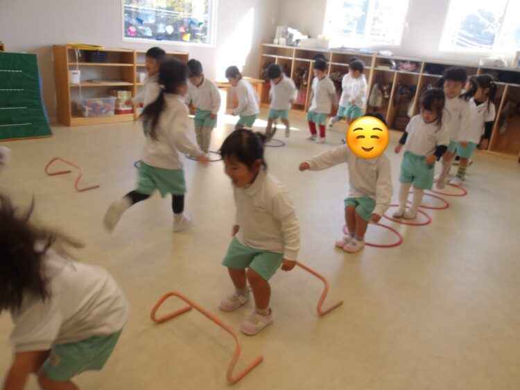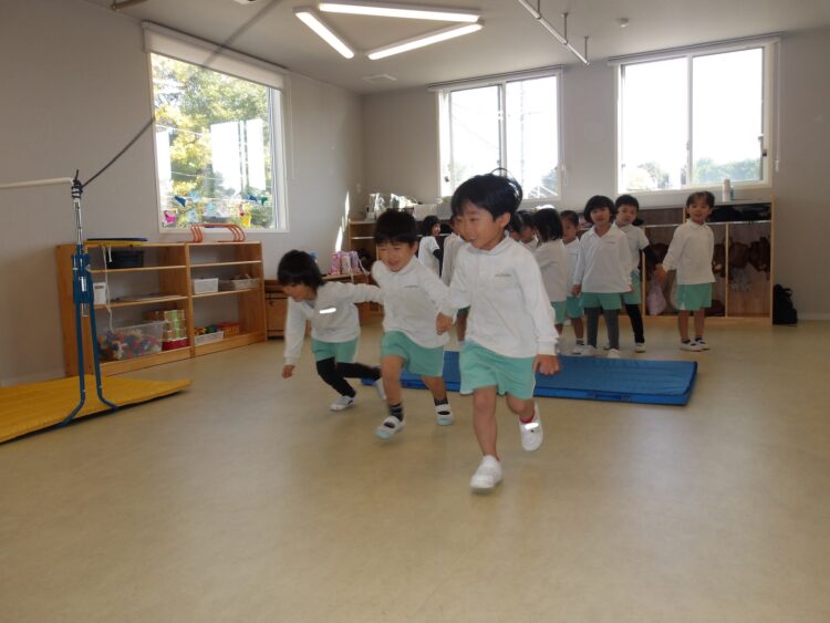 お友だちと手を繋いでネコの罠に引っかからないように走る「ネズミとりゲーム」をしました!うまく縄をくぐり抜けることができました👏🏻