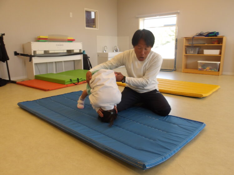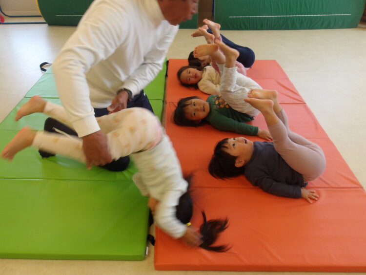 マットに寝てだいこんに変身!先生が足を持って引っこ抜くと、クルン!と後ろまわりができました!