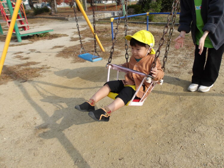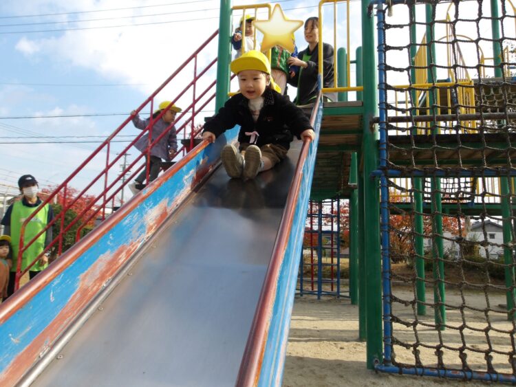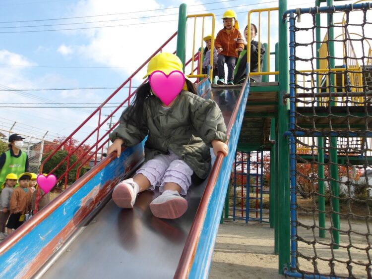 いつもはどんぐりや葉っぱ拾いを楽しんでいましたが、今日は初めて公園の滑り台で遊びました🎵