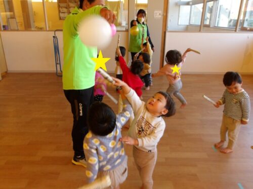 今度は風船を叩いてみよう🎈 先生に当たらないように、上手に叩いてね😆