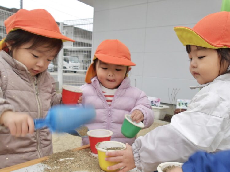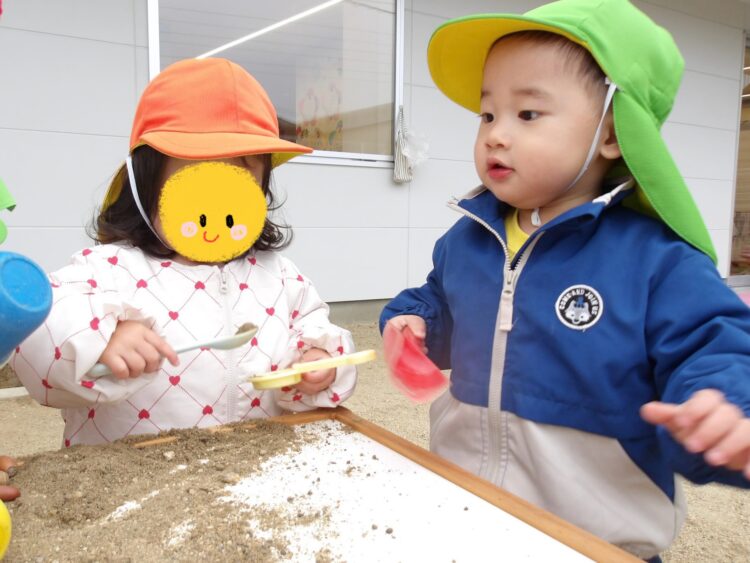 お気に入りのスコップや砂を入れたカップを持ち寄って、お友達とおままごとをして遊んでいました![]()