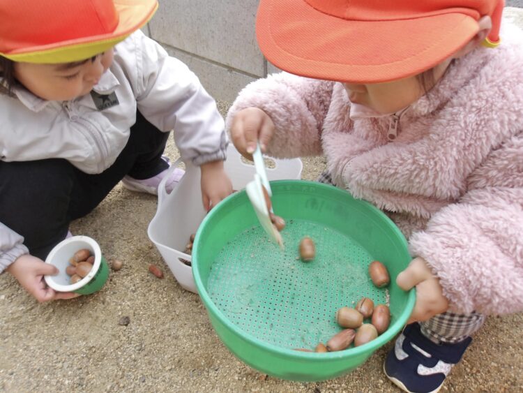 小さいスコップを使って、一つずつ器用にどんぐりを集めています…![]()