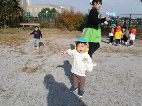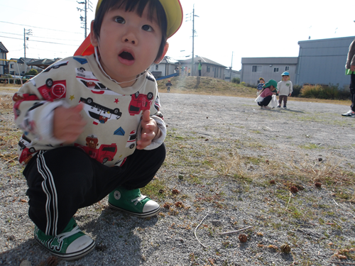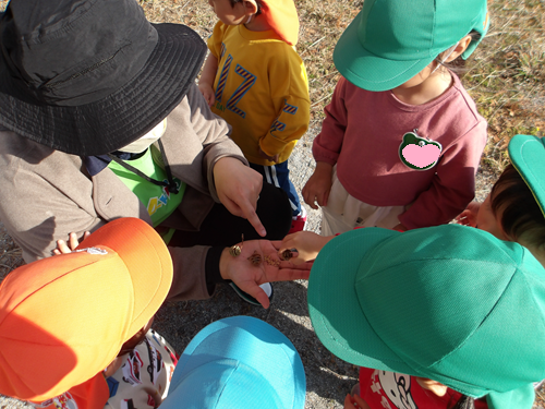 先生と一緒に地面の木の実を見ていると 「!!!むし! しぇんしぇ、むし!」