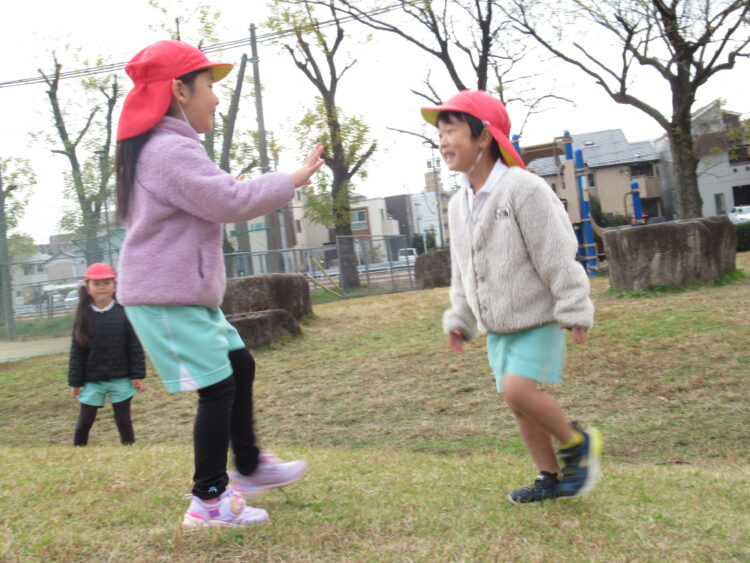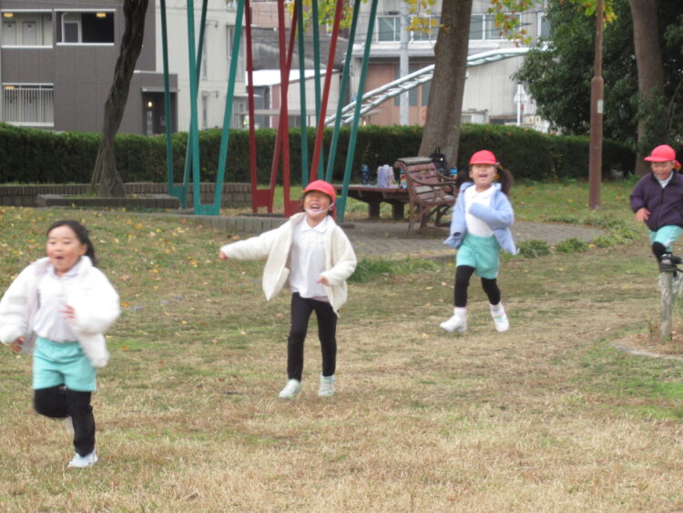塩釜口(4~5歳) のブログホーム > 園のブログ > 塩釜口(4~5歳) 🐘大坪公園🐘 2025.12.3 今日は氷鬼で盛り上がっていたぞうぐみさんこっちだよー!!タッチしちゃうよー!捕まえた!大笑いしながら逃げる子どもたちでした☺️