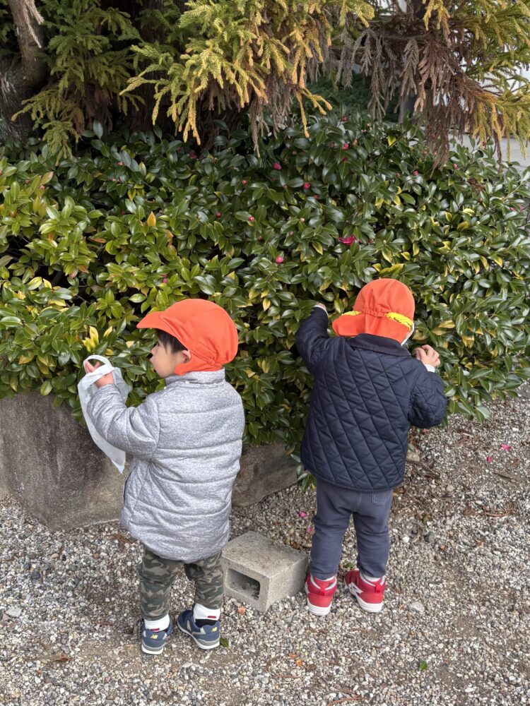色々なピンク色の花やどんぐり、葉っぱや木を拾って袋に入れて楽しんでいました![]()