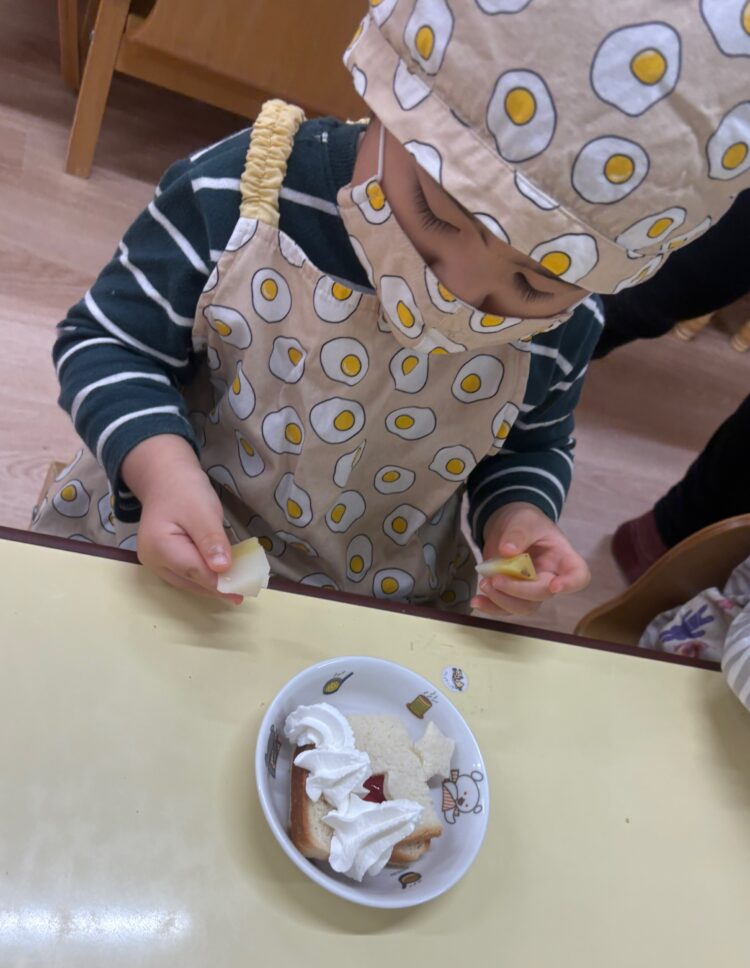 一人ひとりが自分のペースでクッキングを楽しみました。クリームをたっぷりのせる子、ちょんちょんと少しずつのせる子、パンをじっと見つめる子など、それぞれの個性がたくさん見られました👀