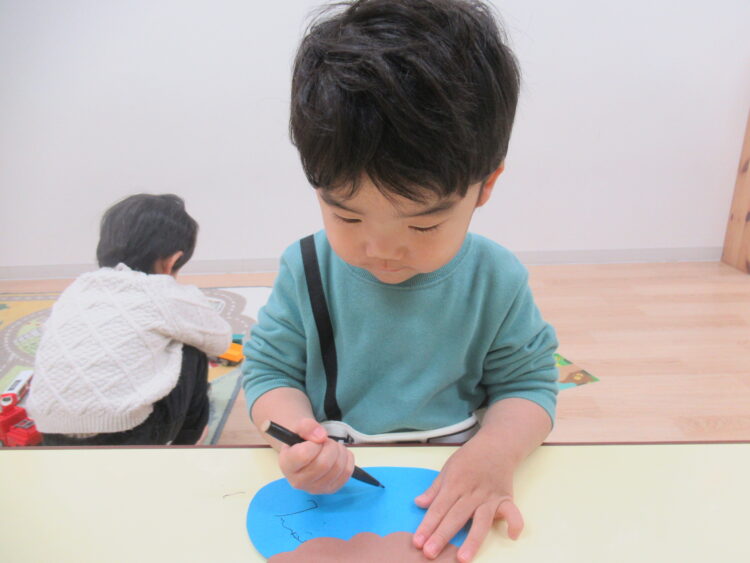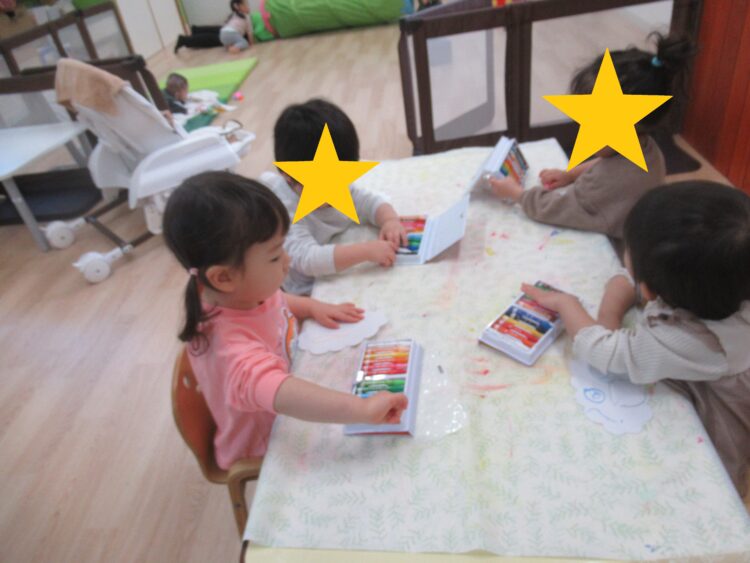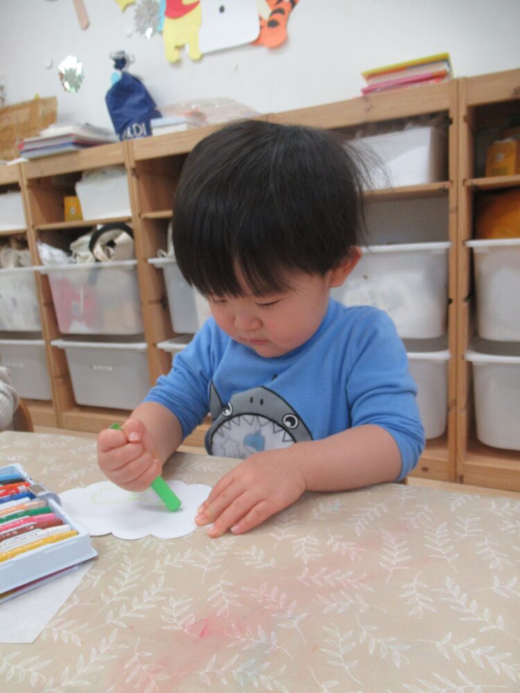 年度最初の頃は1、2人の少人数で行っていましたが、クレヨンは1本ずつ使って終わったら戻そうねなどのお約束事をしっかり覚え、身についてきており、制作を楽しんでいました。