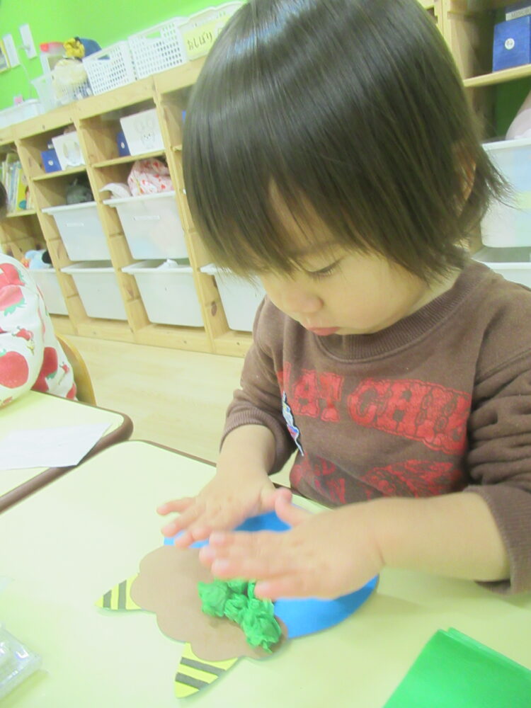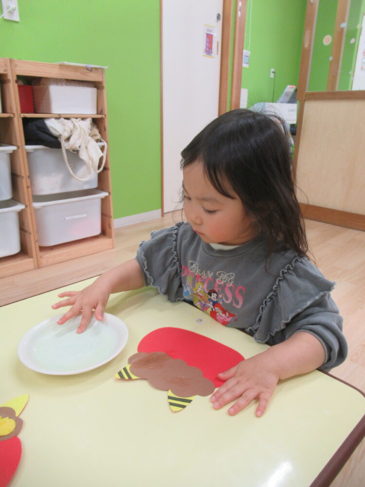 のりを指で塗ったり、貼ったりすることで、指先の動きが発達します。また、決めた場所に貼る作業を通じて集中力が養われます。