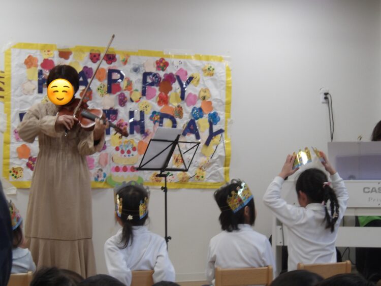 今月もバイオリン🎻の演奏と一緒に、「誕生日のうた」や「コンコンクシャンのうた」、「おにのパンツ」などを歌ってお祝いしたり、