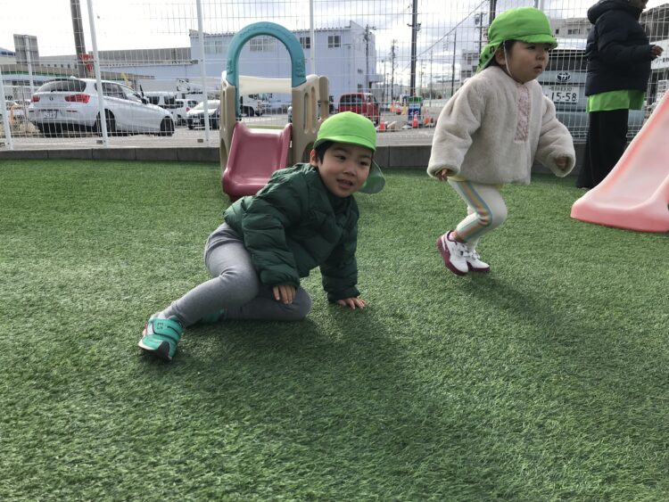 冷たい空気の中、子ども達は 園庭に出るだけで大はしゃぎ![]()
