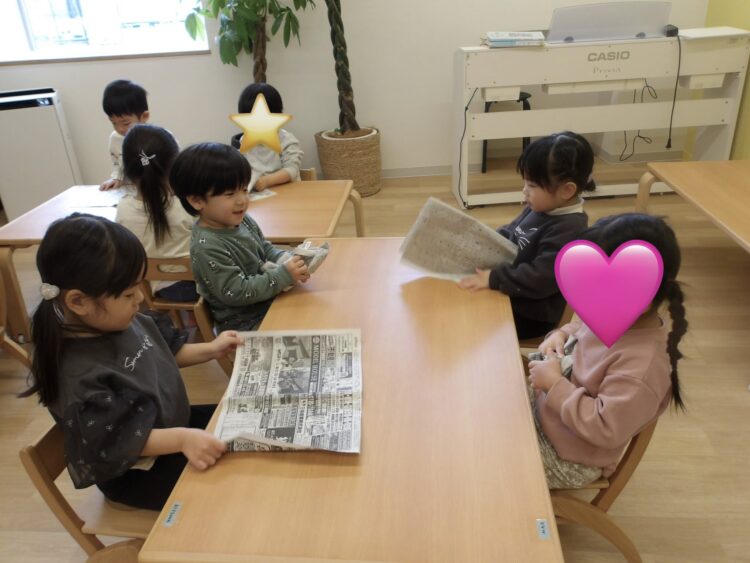 新聞紙を丸めて、何をしているのかな、、、?![]()
