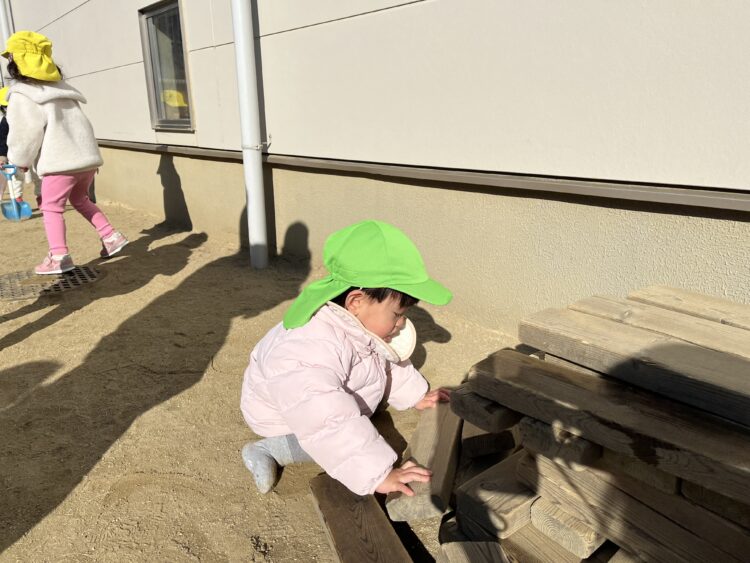 日陰には、雪や氷が少し残っていて「ゆきー❄️」とニコニコで触る姿があったり、「ゆーきやこんこ🎵」と楽しそうに歌っている子もいましたよ☺️