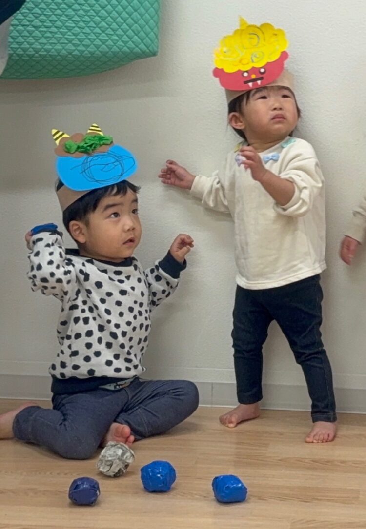 節分の行事として、豆まきを行いました。今回は、ガムテープで作ったボールを豆に見立てて、壁に貼ってある鬼に向かって投げました。