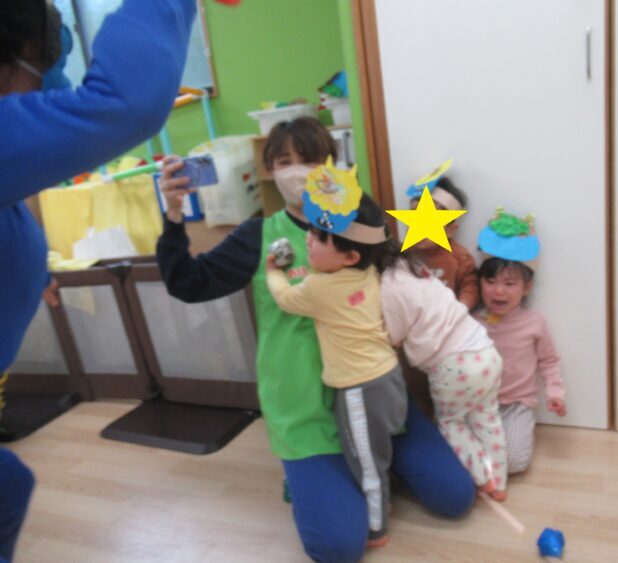 豆まきが始まると鬼が登場し、驚いて泣いてしまう子もいましたが、保育者がそばで声をかけると、少しずつ落ち着く姿が見られました![]()