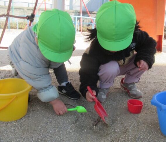 スコップで掘ることが楽しい子、保育者と一緒に型抜きを楽しむ子など、遊び方もさまざまです![]()