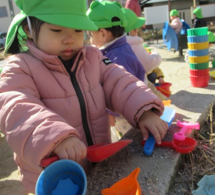 戸外での砂場遊びは、手や足からたくさんの刺激を受け、感触遊びを通して五感を育てる大切な時間です。
