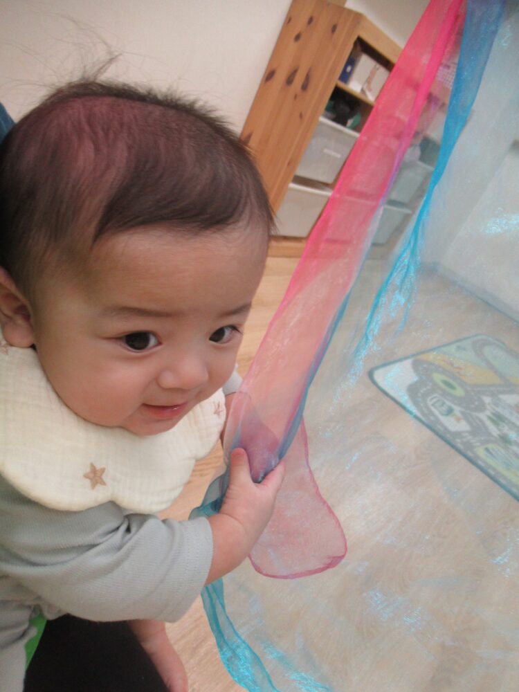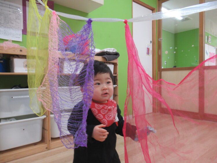 はな組さんは、別室にて、リトミックスカーフのカーテンで、カラフルな色が揺れる様子や、いないいないばあっ!をして楽しみました。
