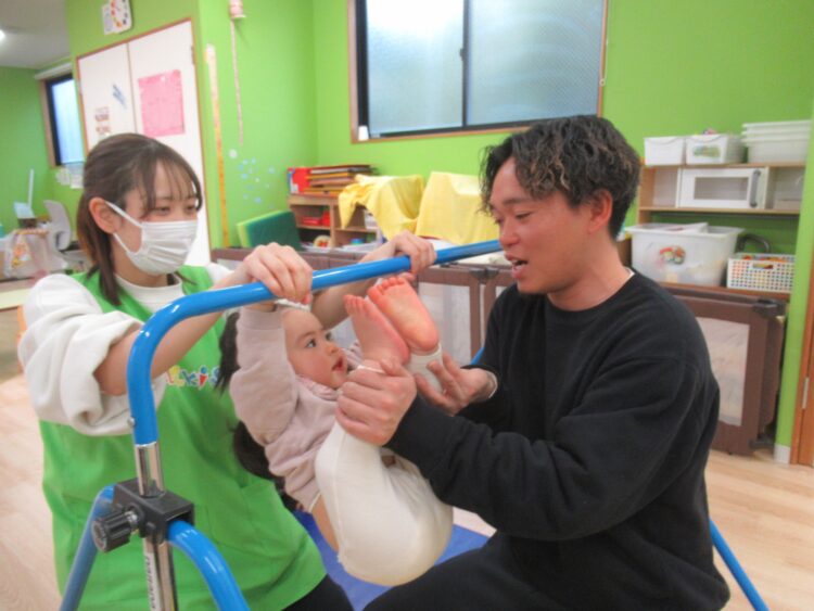 お次は、先生に援助してもらいながら、足を持ち上げて、棒にタッチしていきます。