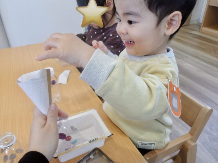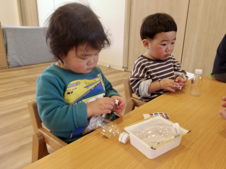 コロコロ転がる立体に貼るのは少し難しかったですが、真剣な眼差しで、手先を動かして上手にシールを貼っていました。