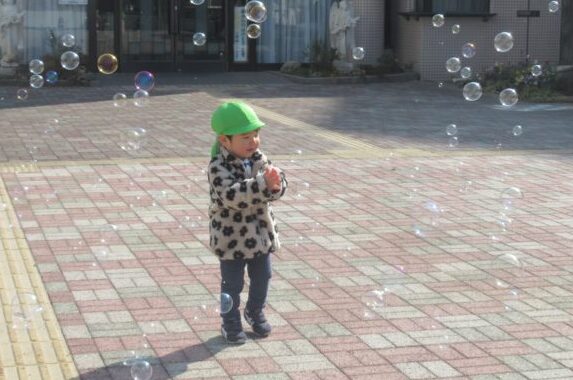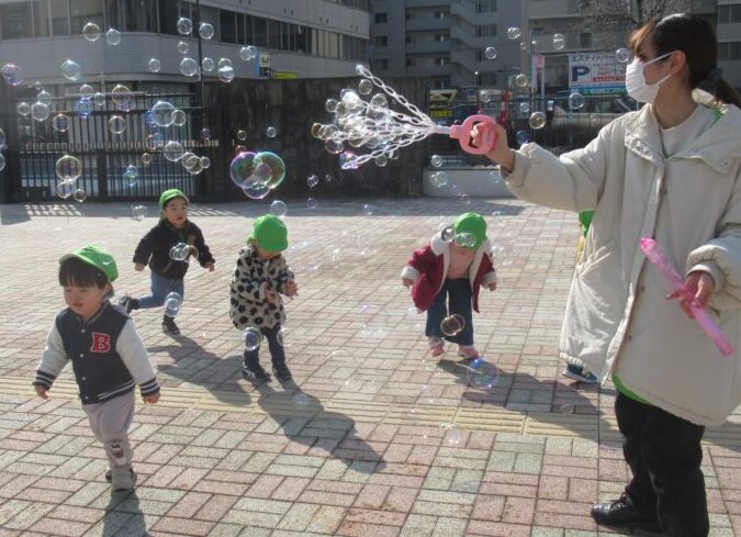 ふわふわと空に舞うシャボン玉を追いかける子どもたちの笑顔がとても印象的でした。