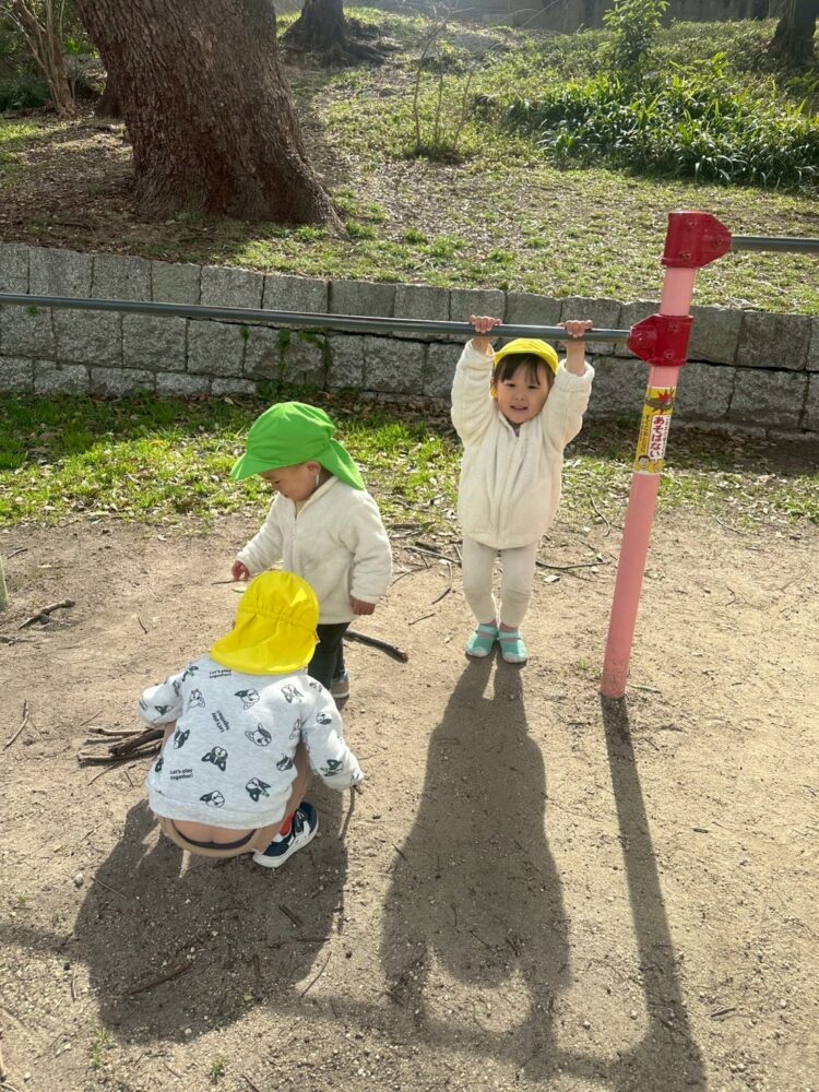 鉄棒をぶら下がって楽しんだり、地面になぐり描きをしている子もいました![]()