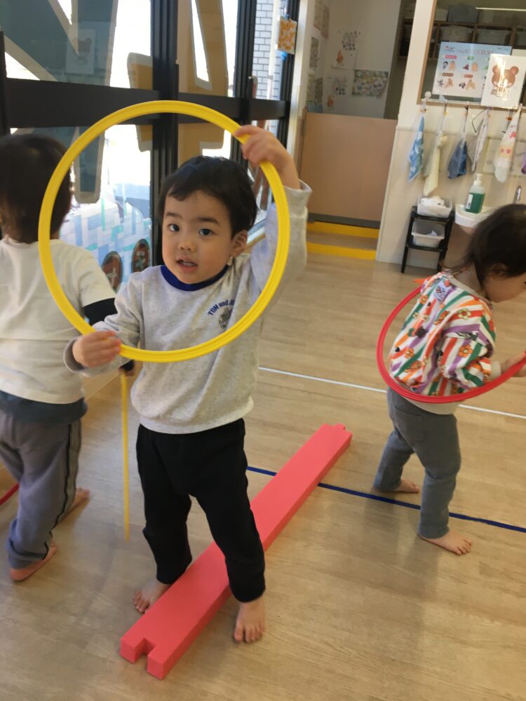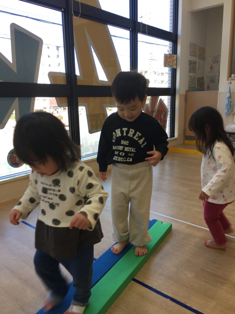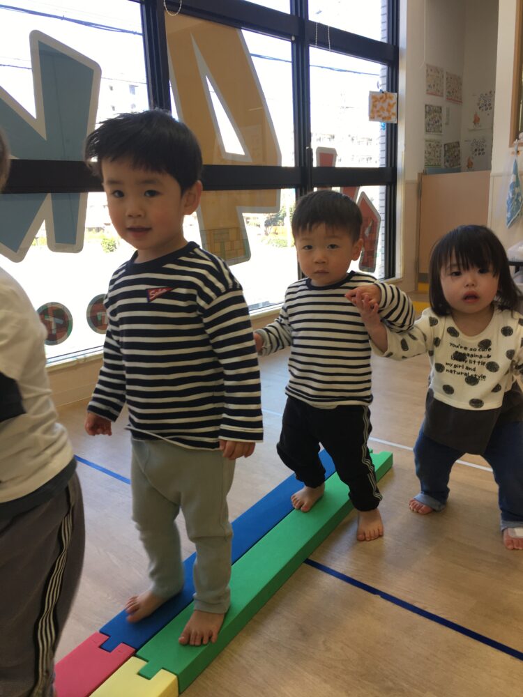 ばなな組さんといちご組さんは、運動遊びをしました。