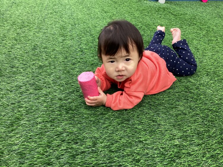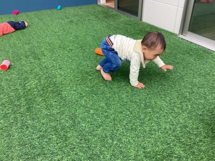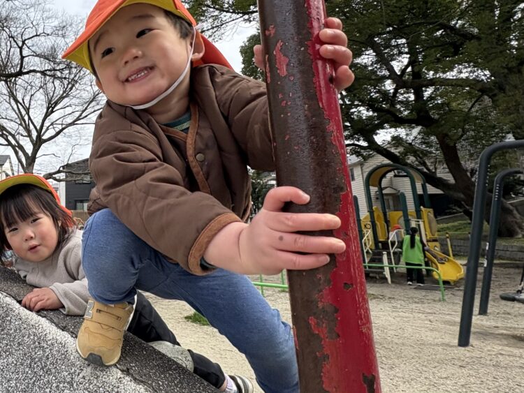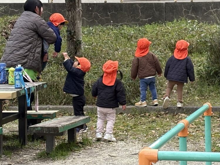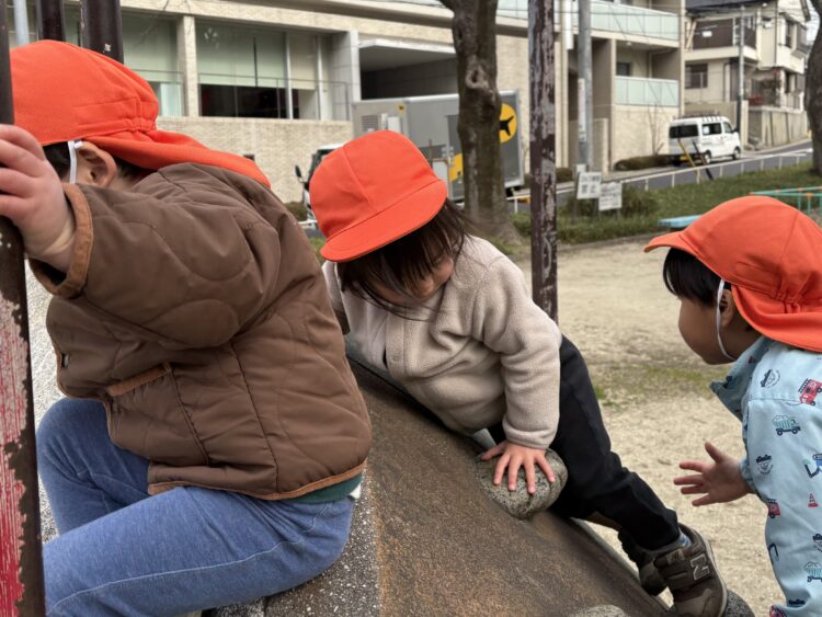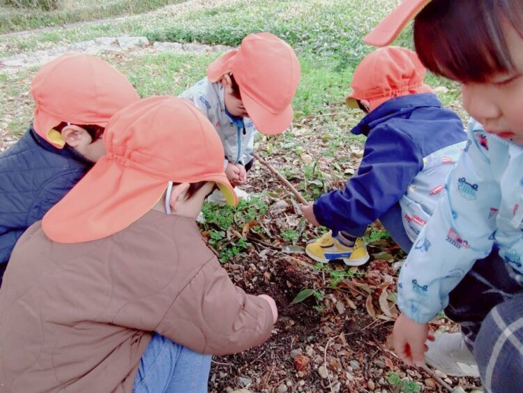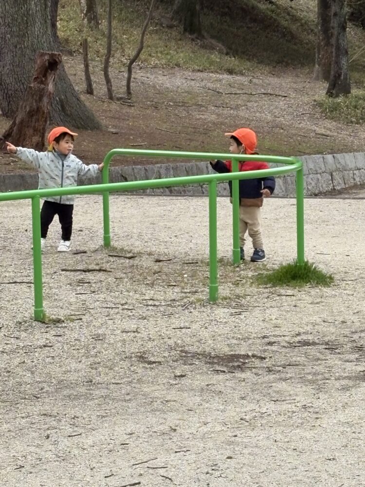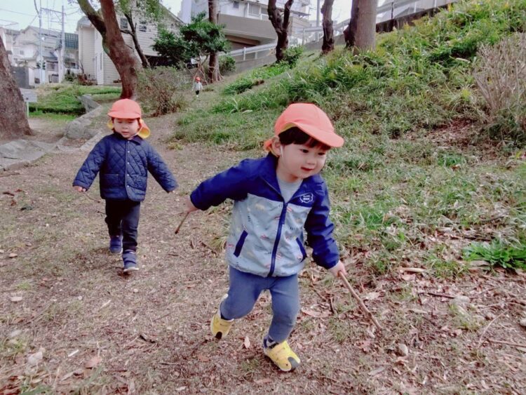 タタターっと走って先生と木の実探しや、大きな木をツンツンホリホリとして取れた物を保育士に見せている姿もありましたよ![]()